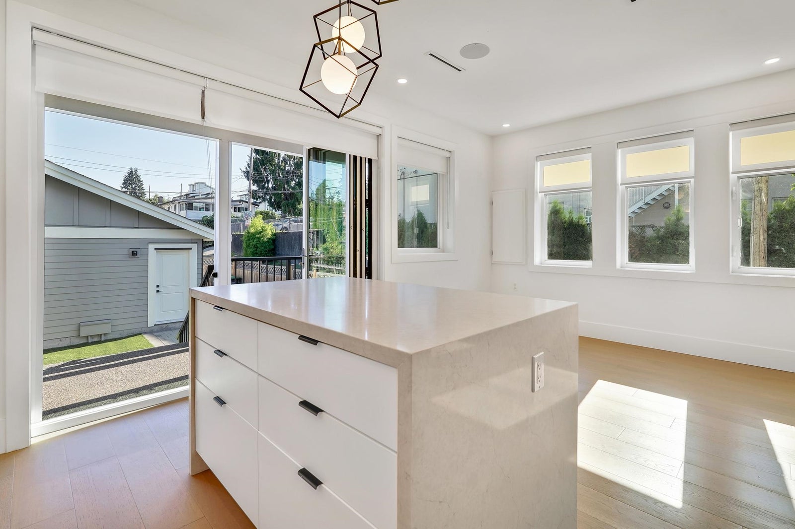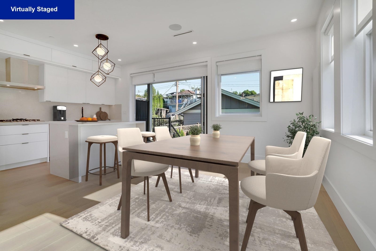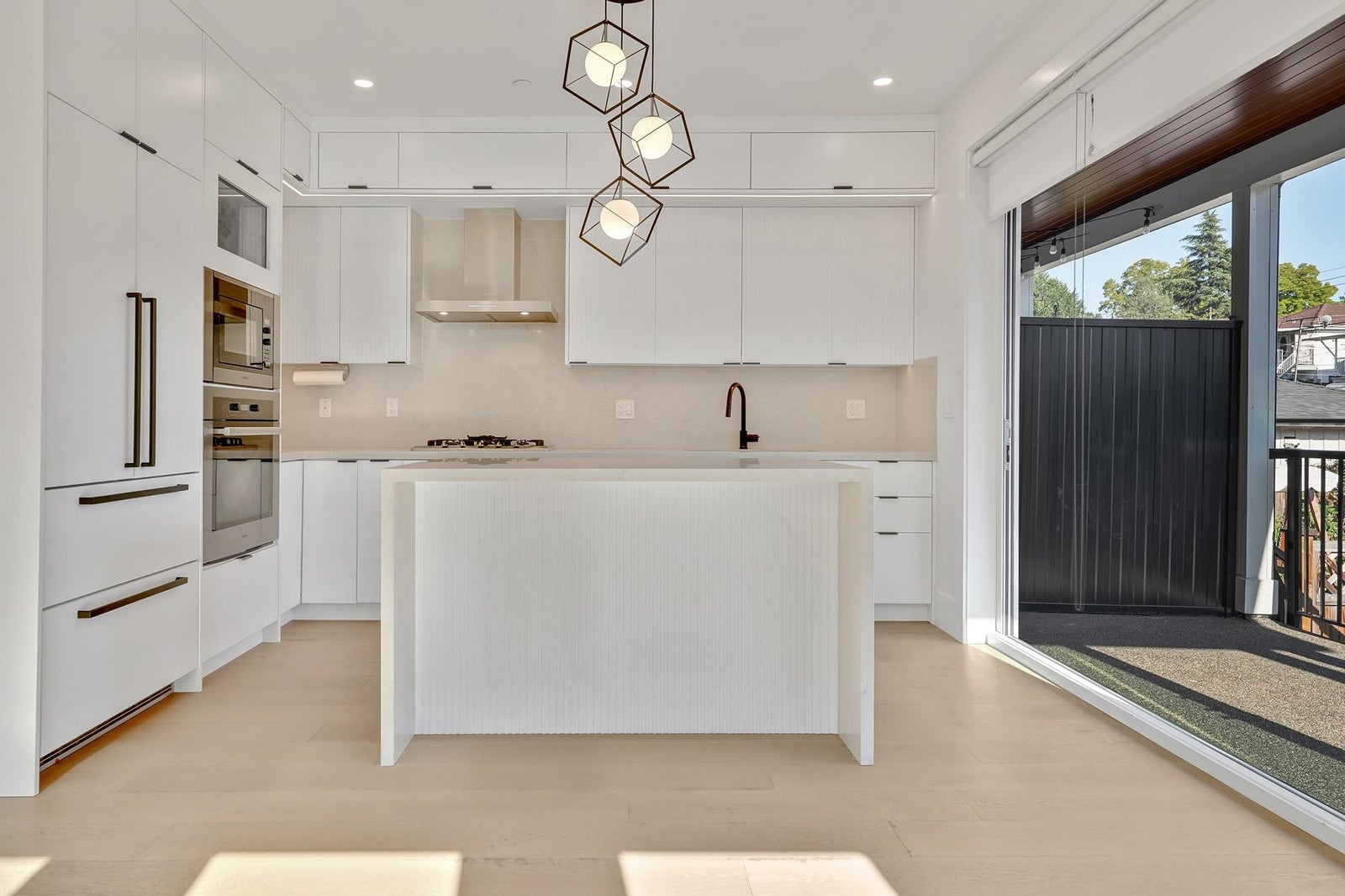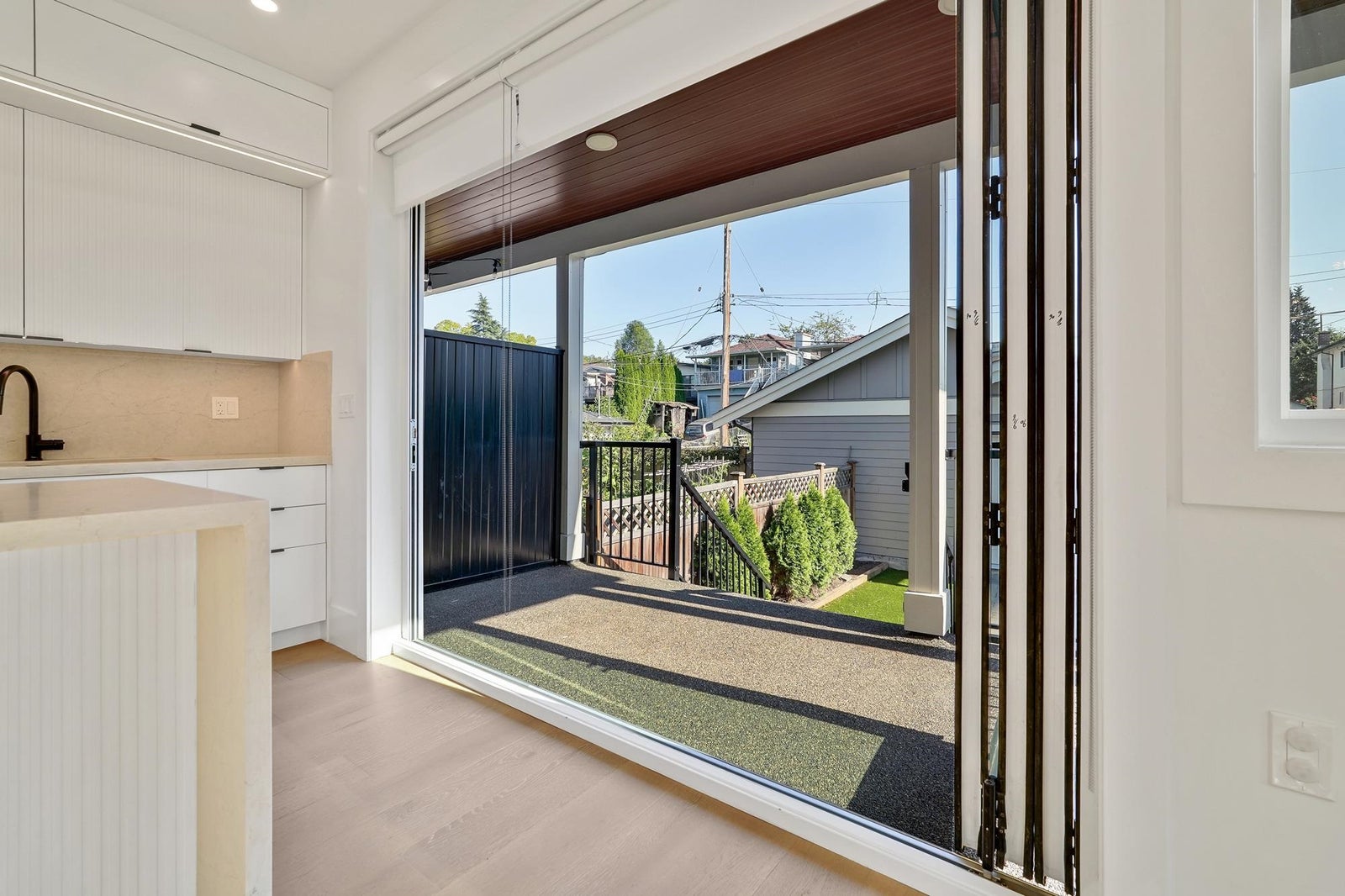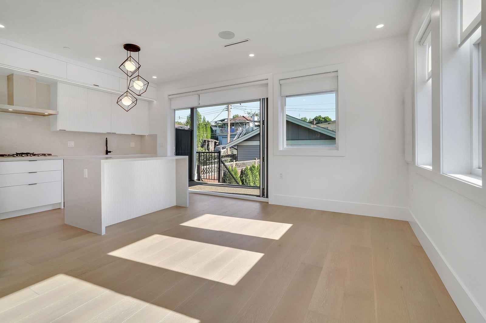 Stunning 1/2 duplex featuring a 1-bedroom legal suite! The main level showcases a open-concept design with a modern kitchen, island, gas range, Miele appliances, and bonus storage. Nano doors extend your living space to a private, covered patio. Expansive windows flood the home with natural light. Upstairs offers 3 bright bedrooms with vaulted ceilings, including a primary with walk-in closet and spa-inspired ensuite. The lower level includes a full suite and a huge crawl space over 600SF for all your storage needs. Enjoy year-round comfort with A/C, HRV, smart home tech, alarm system, and a detached single garage with EV charger. Located in a welcoming neighborhood just minutes from shopping and the heart of Vancouver. Balance of 2-5-10 warranty.