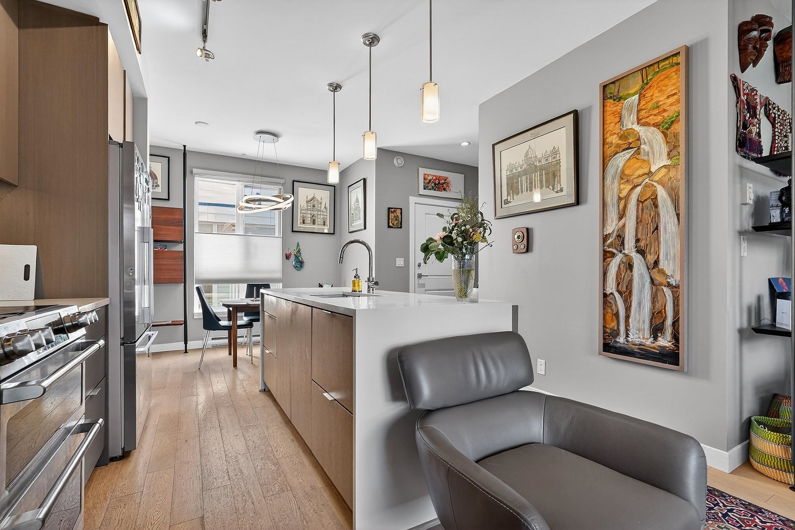 Showstopping 462 sq ft patio with gas fireplace sets this exceptional 3-bedroom corner home apart. This unique space is perfect for year-round entertaining and indoor-outdoor living! Excellent location close to all you need has been tastefully updated. Great for a family downsizing or student housing with proximity to UBC. This beautiful home features stone countertops, a new double stove and induction cook top, A/C, and thoughtful designer touches throughout with well organized storage. Includes 2 parking stalls (1 EV) and 1 storage locker. This classy home will not disappoint! Steps to shopping, restaurants and transit.