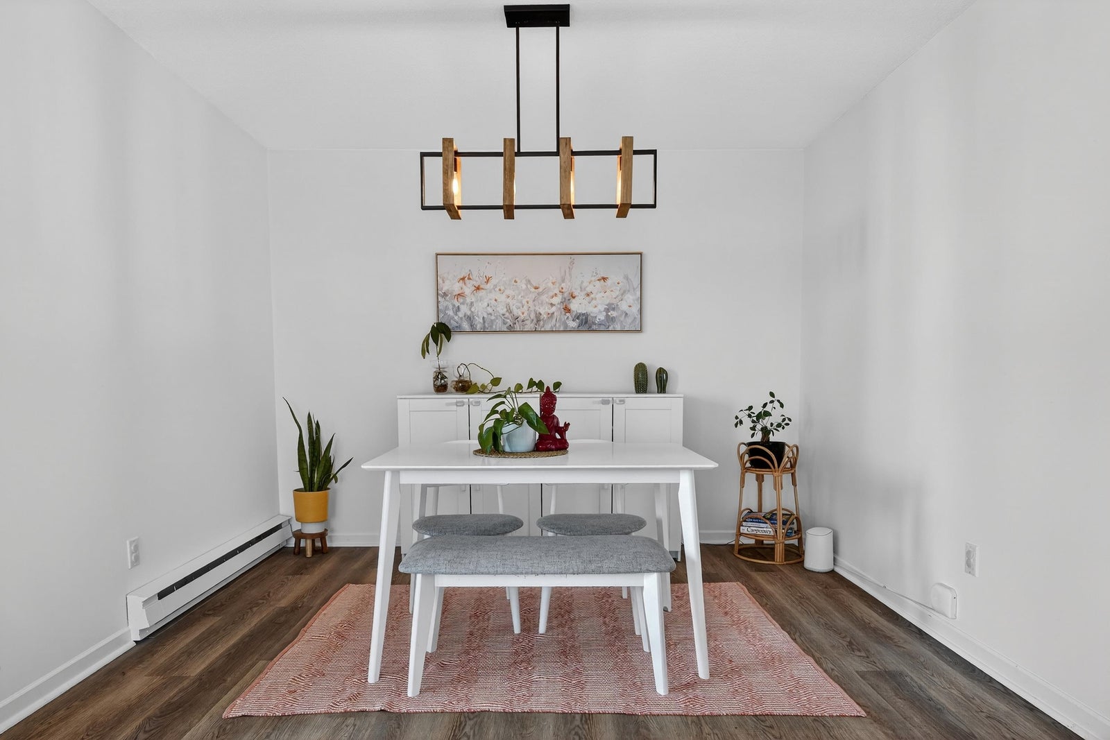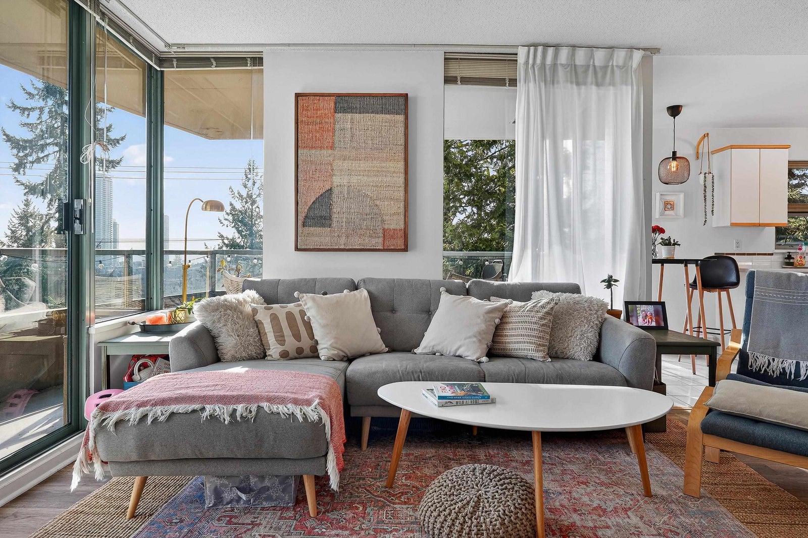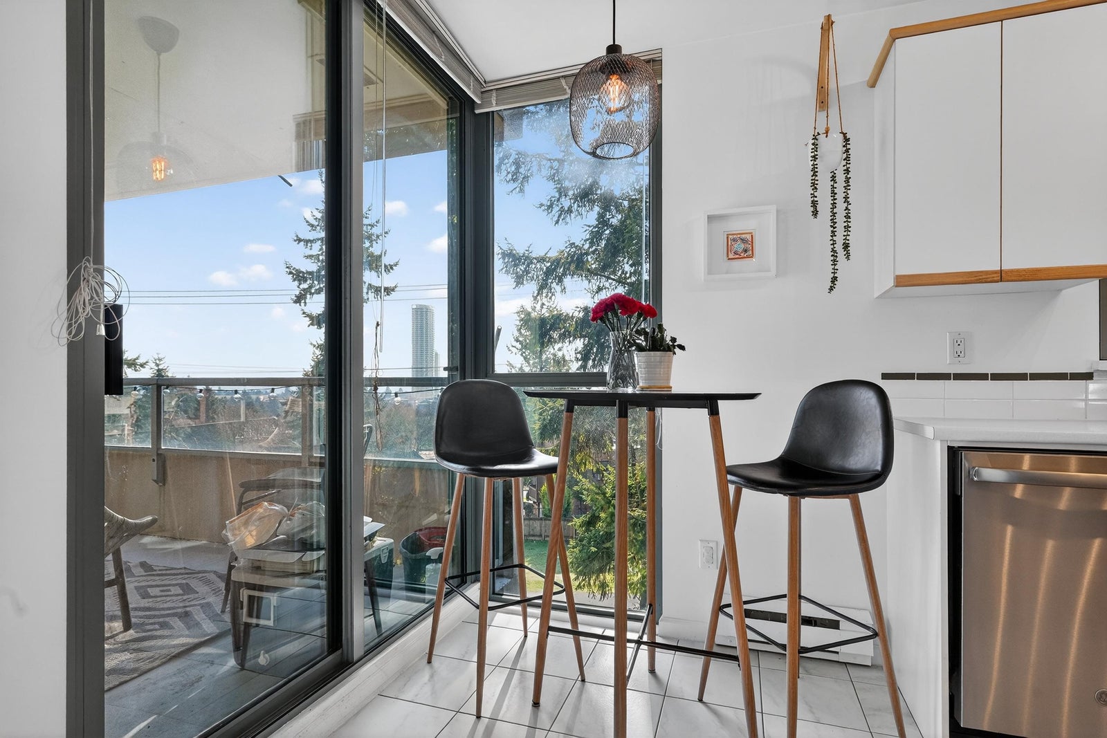 SE corner suite in The Dunhill! This spacious 2 bedroom, 2 full bathroom home offers an exceptional layout featuring laminate flooring, a cozy gas fireplace, updated appliances in 2022 and a large formal dining area perfect for entertaining. Floor-to-ceiling windows fill the space with natural light. Step onto the covered wrap-around balcony and enjoy panoramic views year-round. Includes in-suite laundry and storage plus a storage locker. Great location steps to Edmonds Station & Highgate Village.