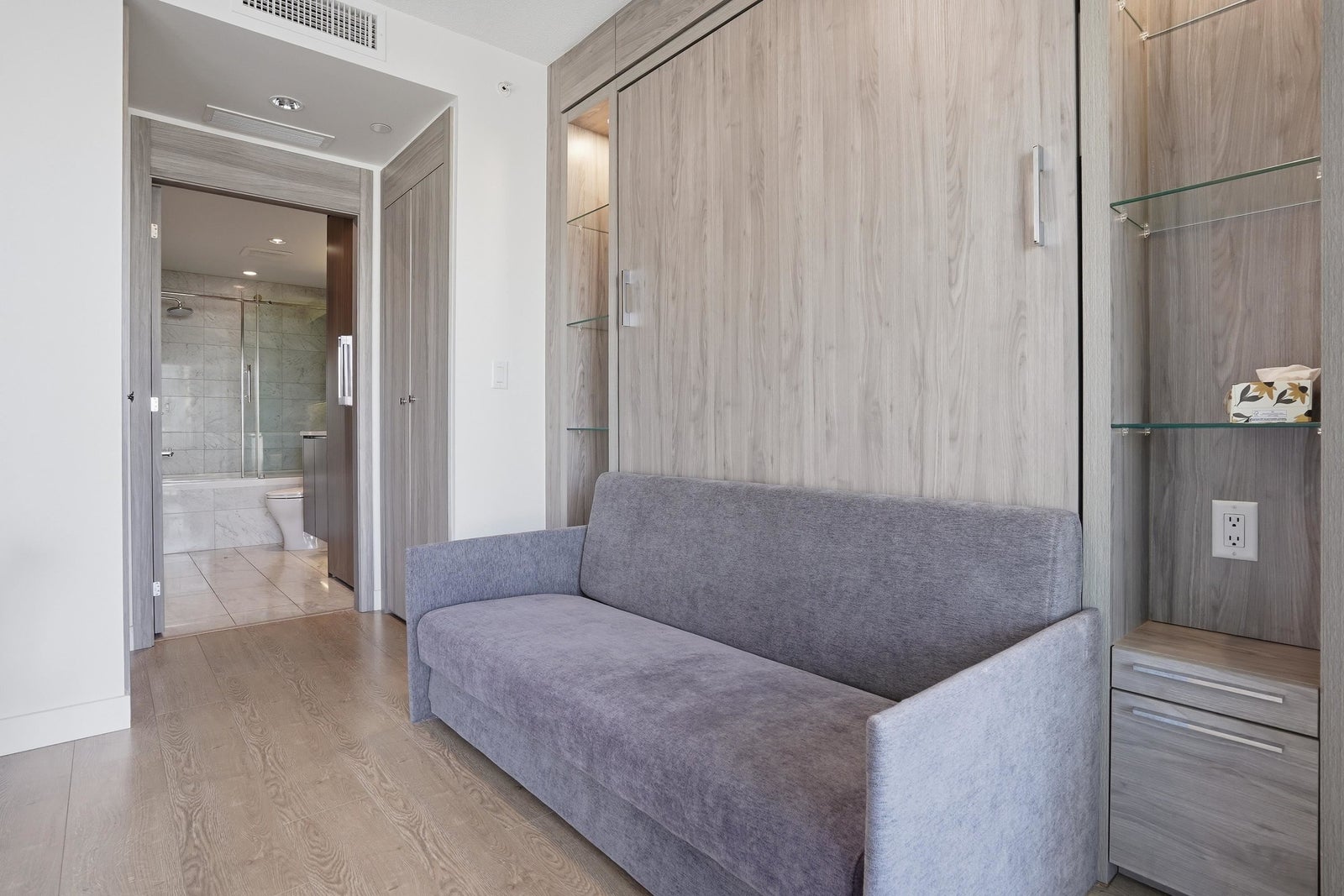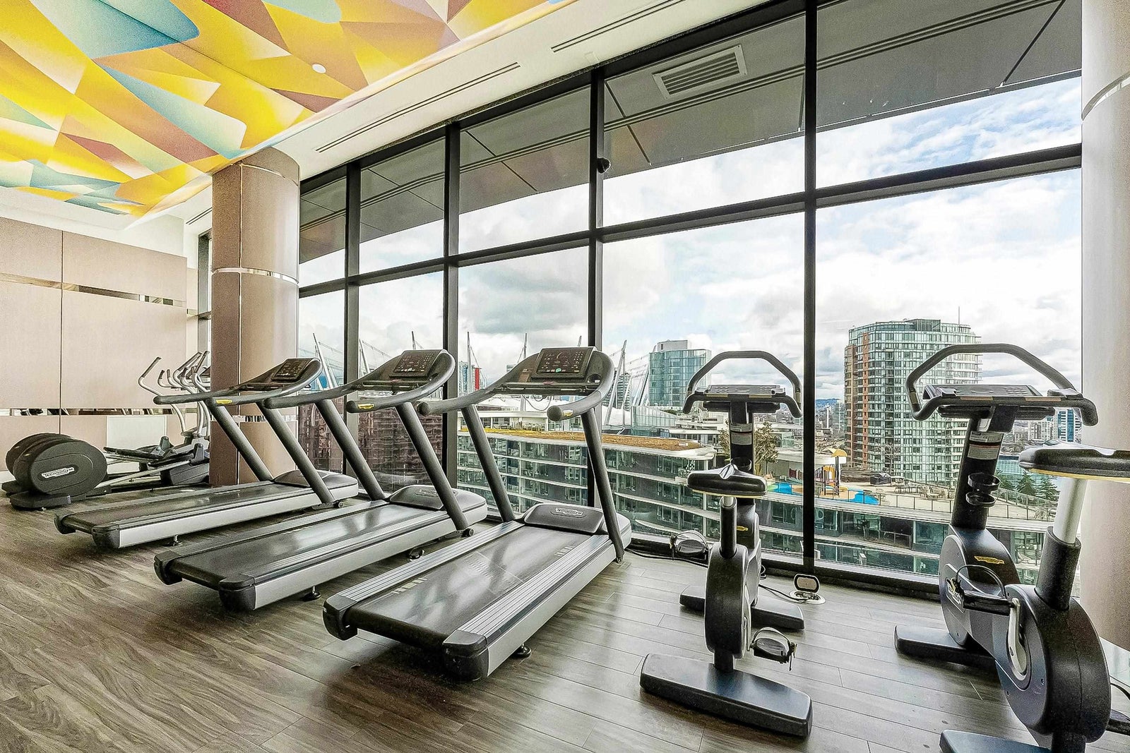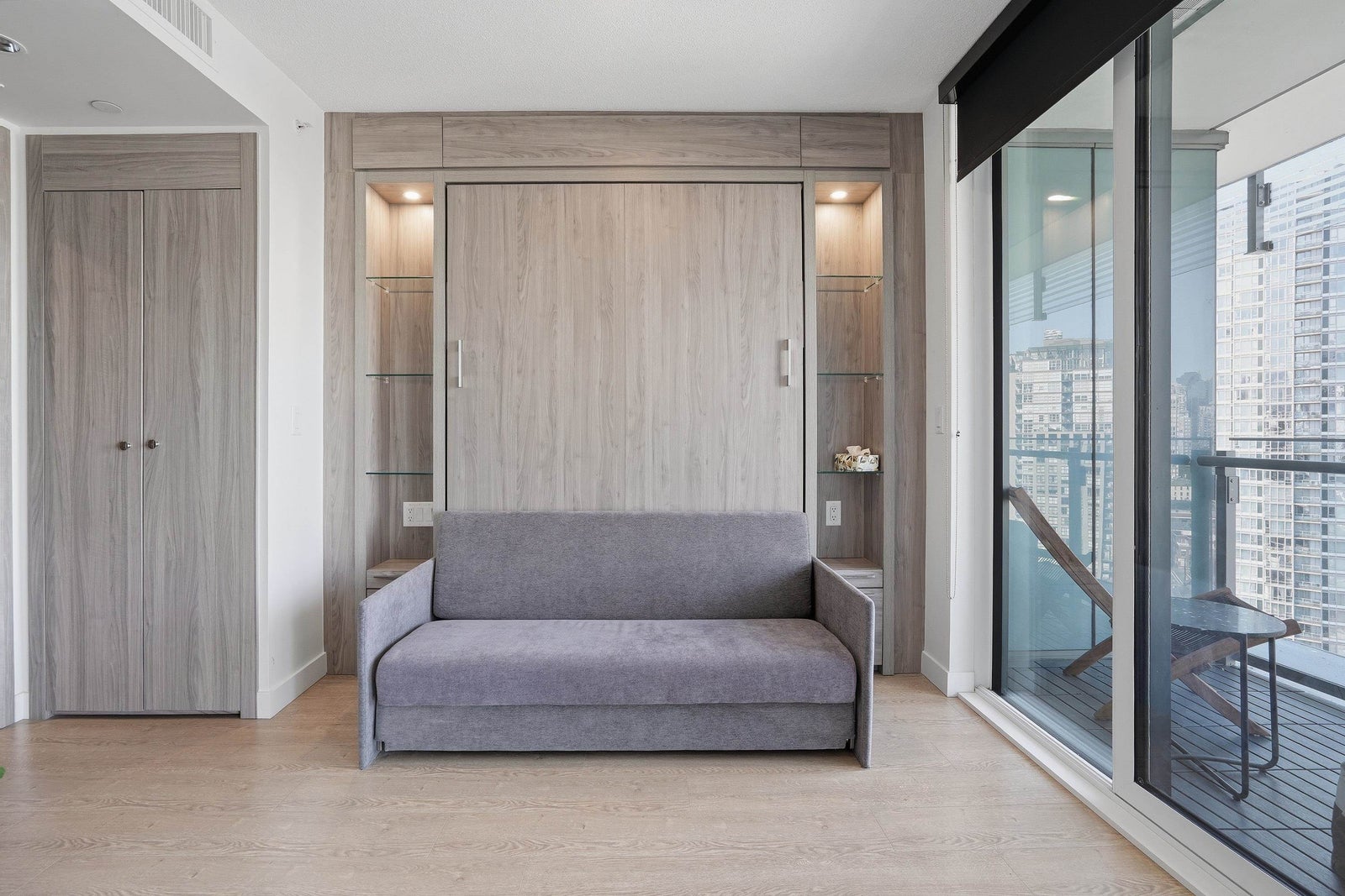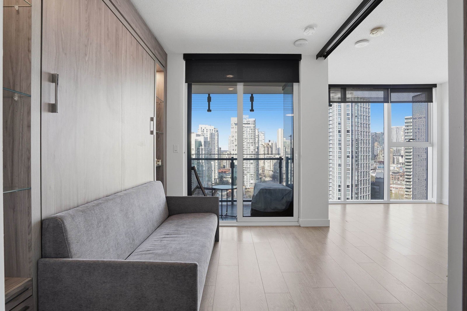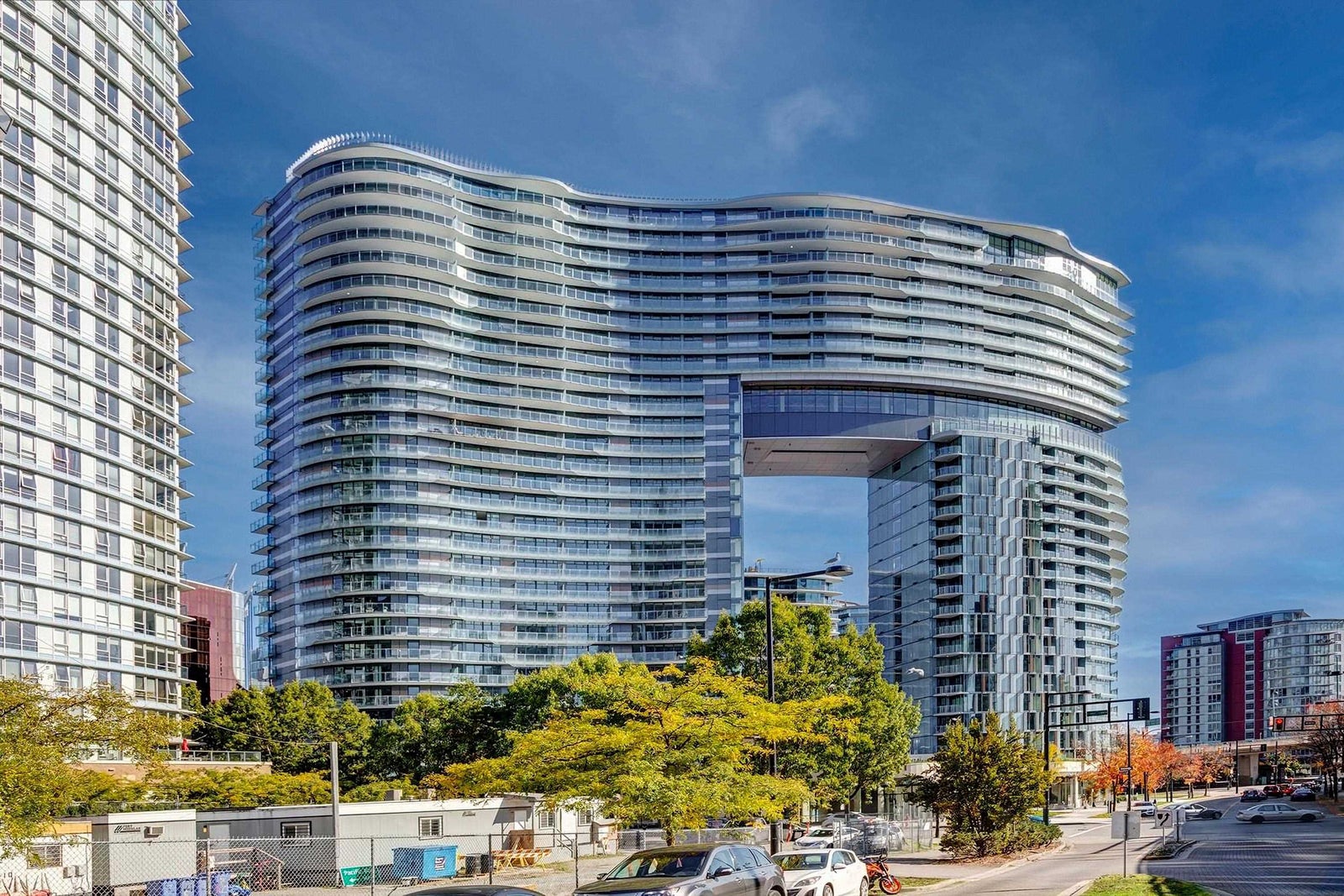 Experience iconic living at The Arc! This bright and well-appointed 18th-floor home offers stunning city and partial water views through floor-to-ceiling windows. Efficient open layout with modern finishes, A/C, and high-end appliances. Bedroom has sliding frosted glass doors and built in couch-murphy bed. Enjoy Concord’s signature Sky Club featuring a glass-bottom pool, full fitness centre, sauna, and lounge. Prime False Creek location steps to Seawall, BC Place, transit, and dining. Perfect for end-users or investors seeking a landmark address with strong rental appeal.